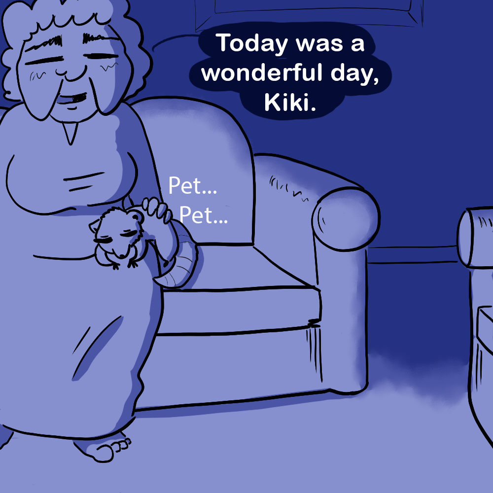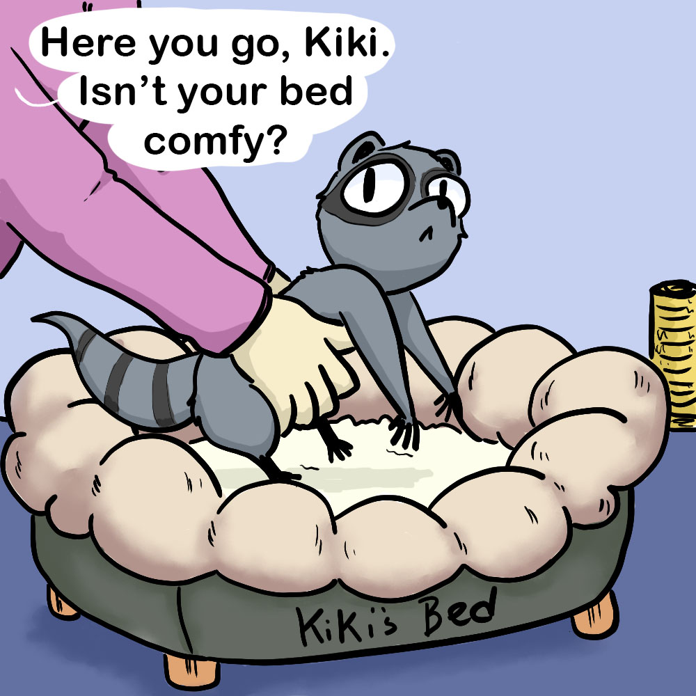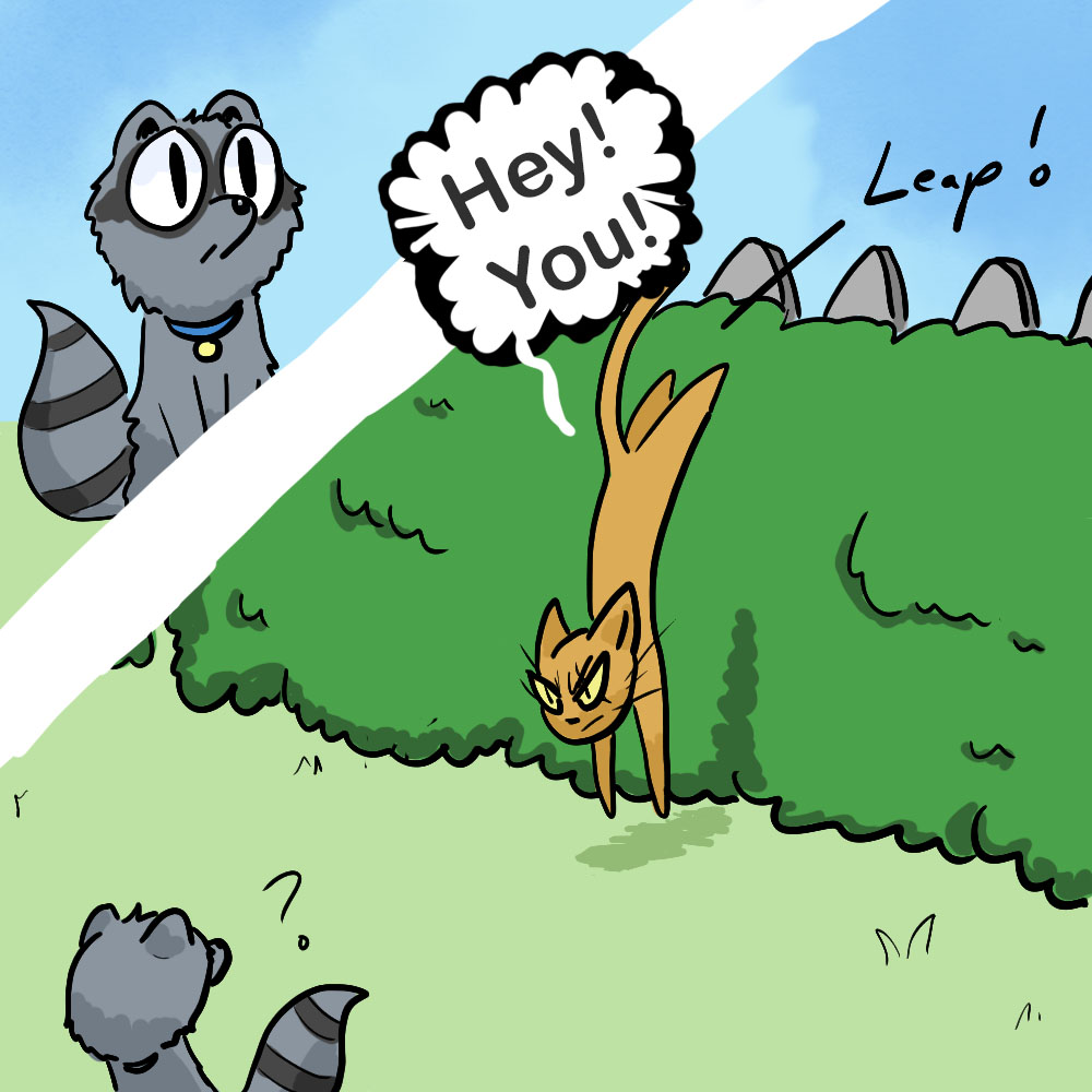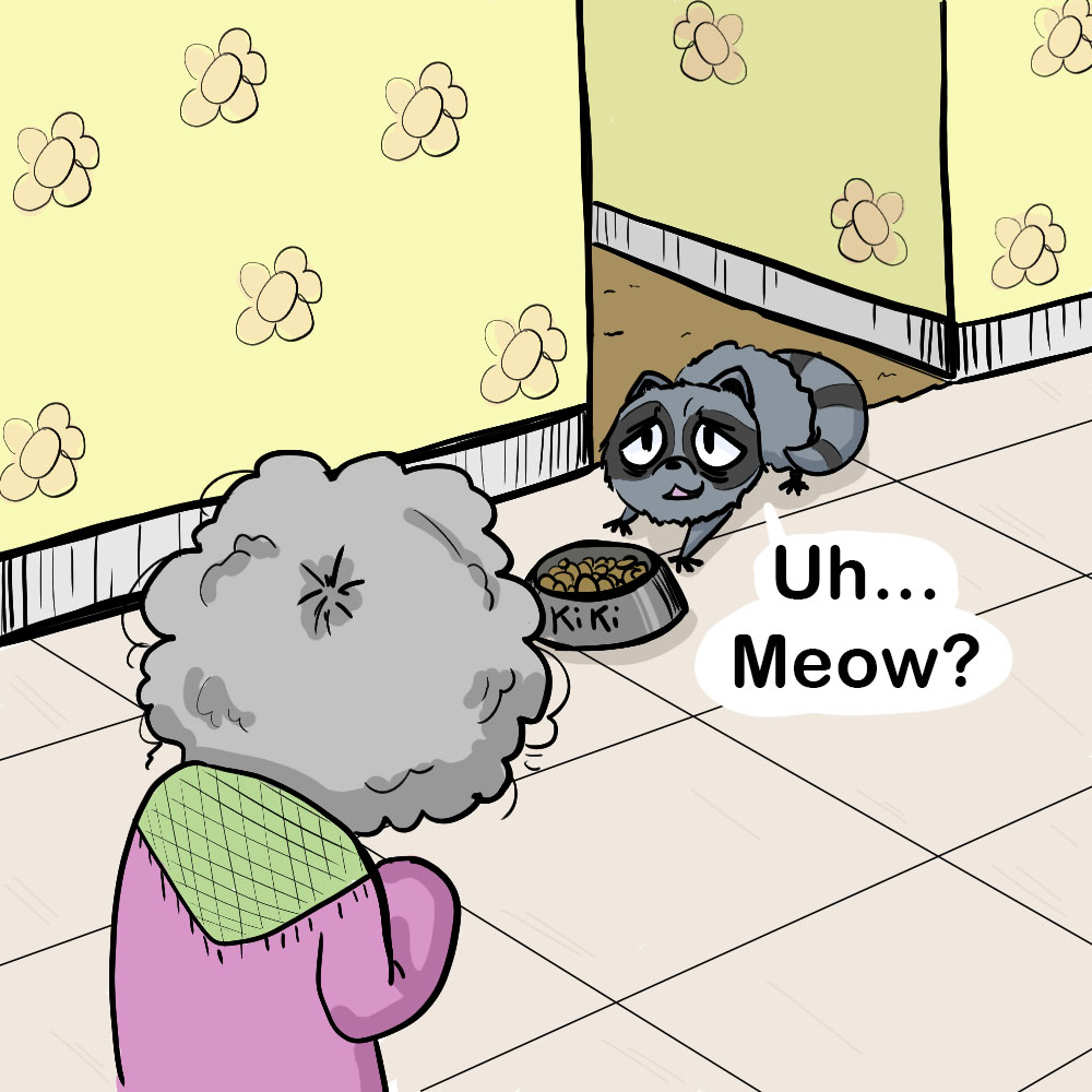 Currently, I draw comics about being an author, and occasionally about a silly raccoon who pretends to be a cat in order to get food and board, lol. The elderly lady has bad eyesight and thinks the raccoon is her cat, Kiki (when it’s obvious to everyone else he isn’t).